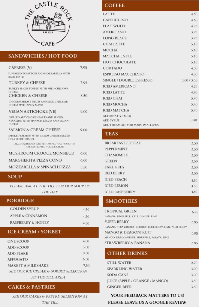 The Castle Rock Cafe is situated in Makars’ Court and is just starting it’s legacy as a staple feature. Started in 2024 with the goal of bringing a high quality, authentic and original eating experience to the court, The Castle Rock Cafe looks forward to a future of serving high quality breakfasts, lunches, brunches and all other ranges of delicious foods and snacks. We spent month’s uncovering the historical architecture and restoring it to it’s former glory. We augmented the atmosphere with our own cosy additions. We are now proud to deliver the most homey, cosy and old towney environment in Edinburgh!